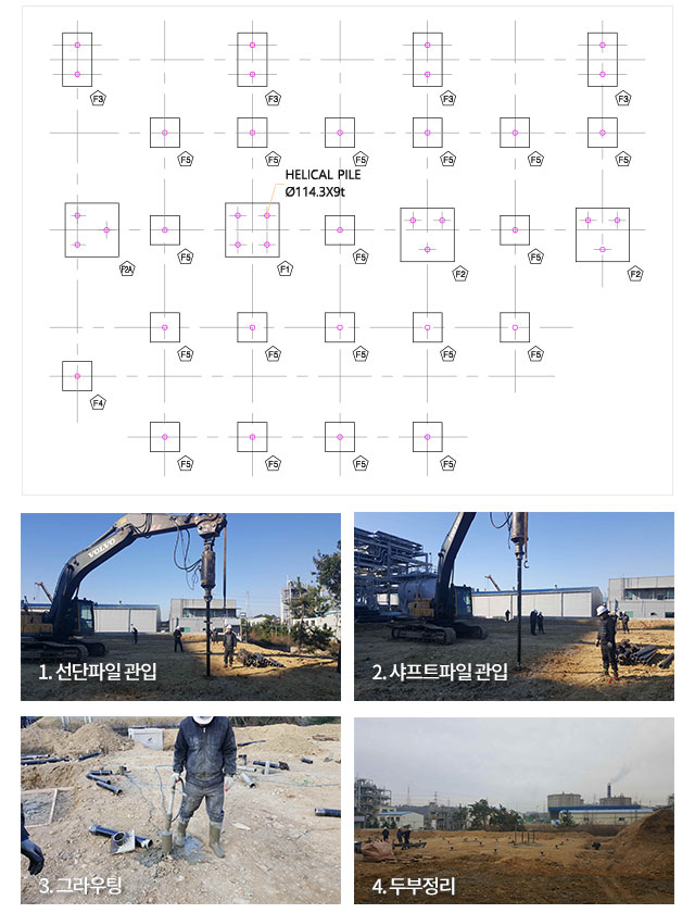 헬리컬파일(Helical Pile)은 고강도 강관파일에 나선형 강판(Helix)을 달아 회전력을 통하여 지반에 관입시켜 그라우팅으로 보강하는 공법으로 스크류 파일(Screw Pile), 로터리 파일(Rotary Pile)등으로 불리우며, 나선형 회전운동을 통해 주면 마찰과 선단지지를 함으로써 지지력을 최대화하여 압축과 인장력에 탁월한 안정성을 확보할 수 있는 공법이다.