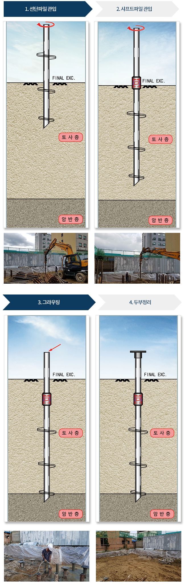 나선형 회전운동을 통해 주면 마찰과 선단지지를 함으로써 지지력 확보
