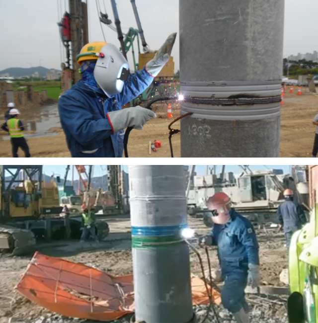 - PHC PILE의 이음방법에는 용접이음과 무용접이음이 있는데,일반적으로 반자동 아크용접방식을 사용한다.