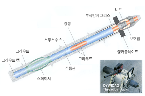 강봉 앵커는 그라우트의 부착력에 의하여 인장력에 대응하는 공법으로 인장재로 고강도강봉(Dywidag bar)을 사용하며 완벽한 이중방식과 너트타입 정착으로 재긴장이 간편한 공법이다.