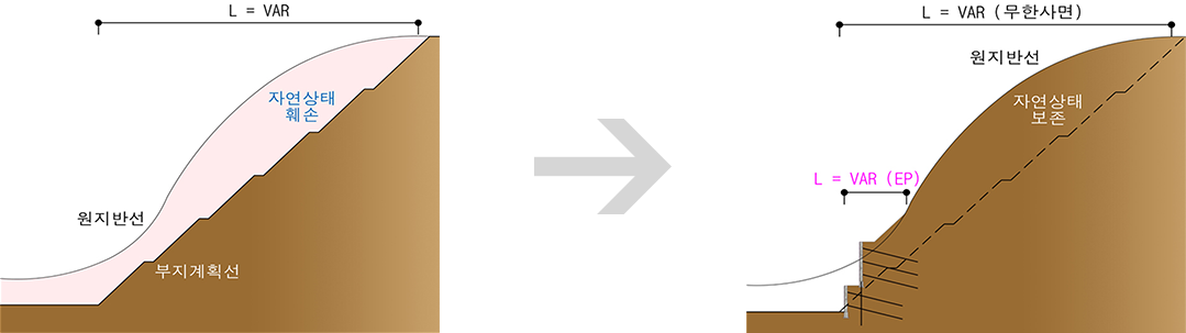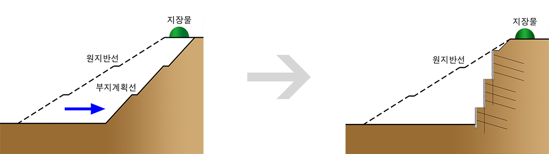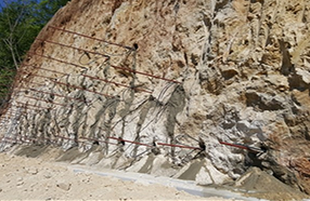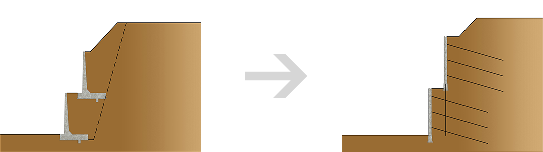 - 원지반절취 후 Top-down방식으로 지반보강재인 네일링 또는 앵커를 원지반에 삽입, 그라우팅하여 비탈면을 안정화시키고 보강재와 천연석재 패널을 연결하여 옹벽체를 형성하는 공법