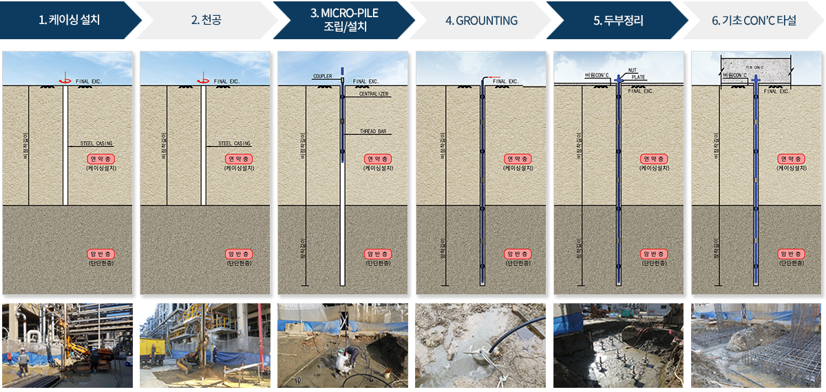 마이크로파일은 고강도의 나선형 강봉(Thread Bar)을 주자재로 사용하며 소구경 천공장비로 천공 후 강봉을 삽입하고 시멘트 그라우트를 주입하여 말뚝체를 형성하는 공법으로, 높은 하중을 전달하면서