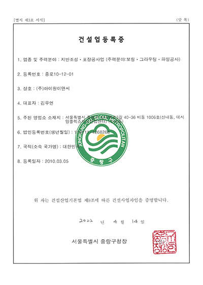 건설업 등록증(보링ㆍ그라우팅ㆍ파일공사)